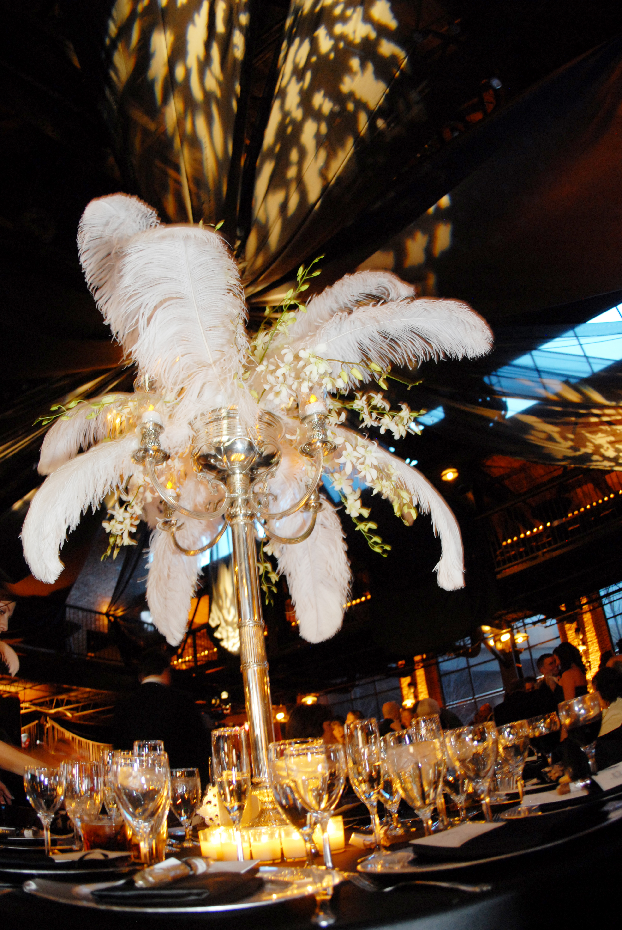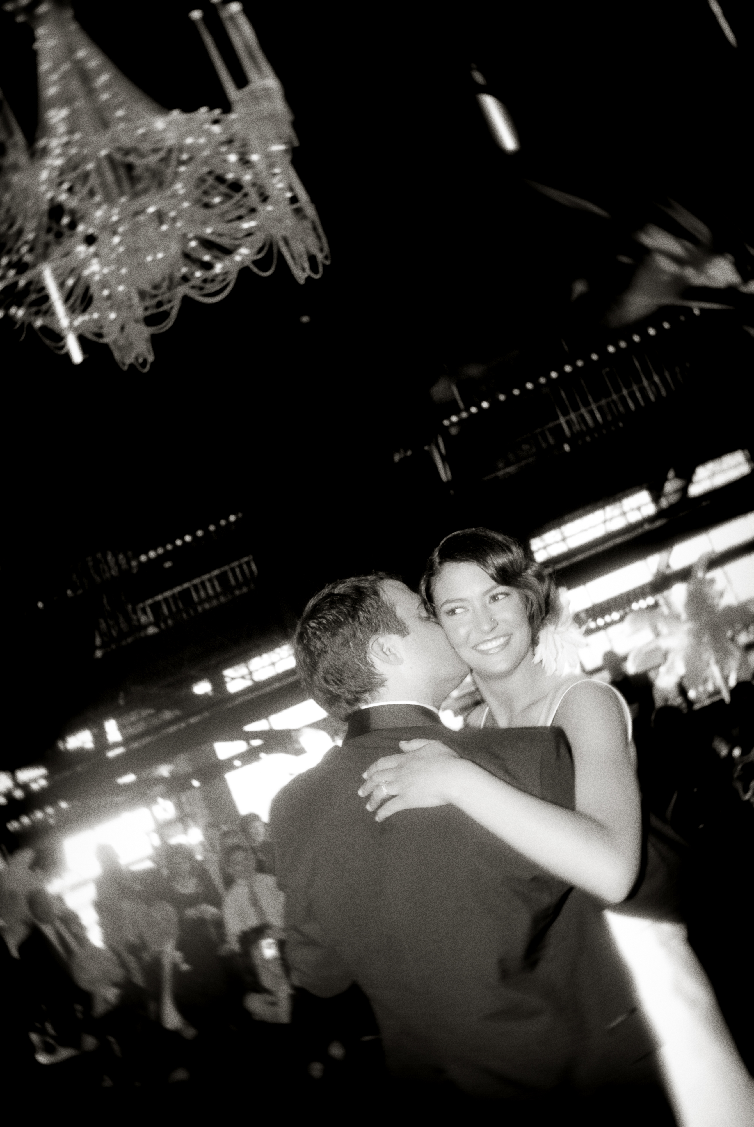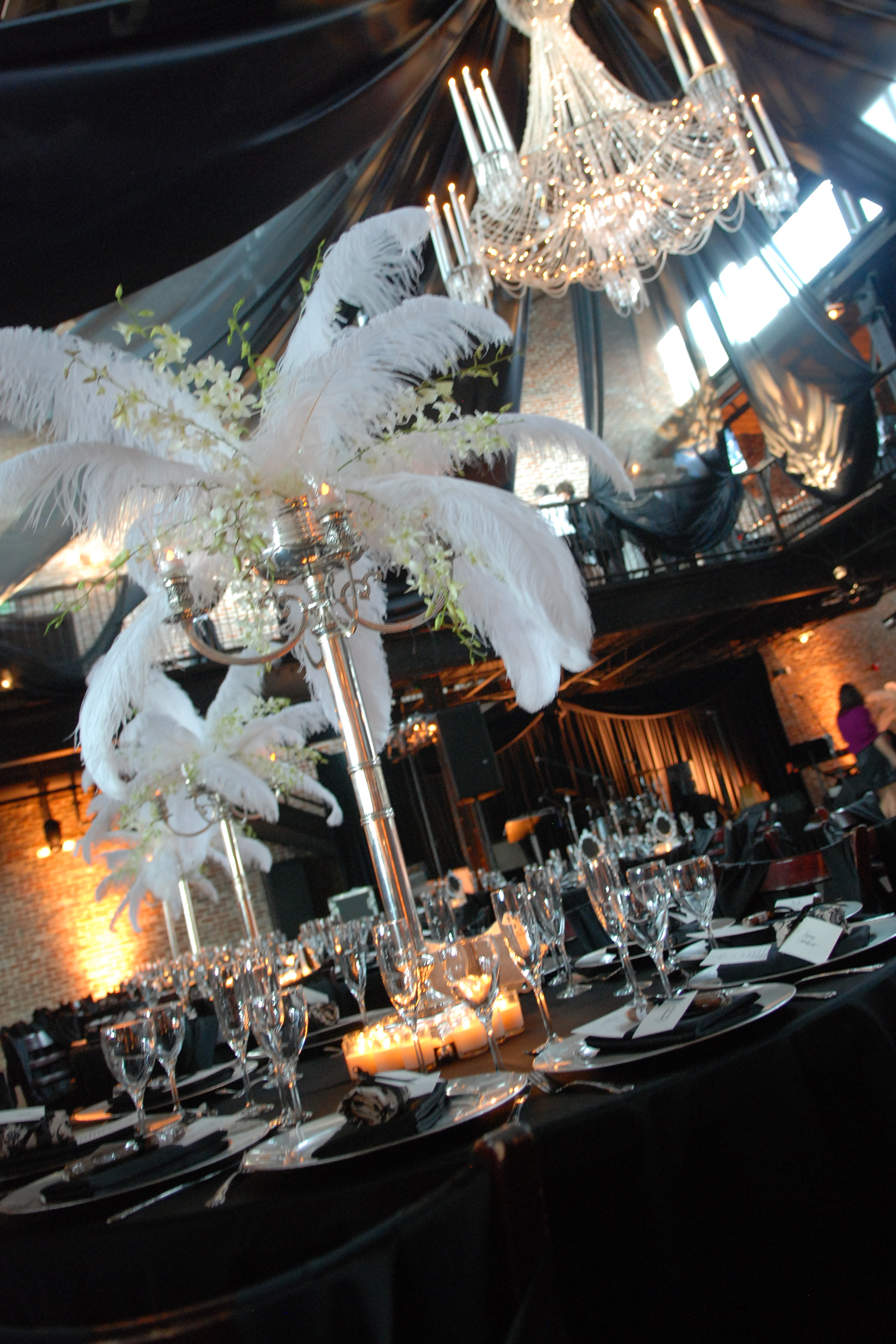 Nearly 180 guests dined and danced in a ballroom transformed into a black and white wedding extravaganza. A three-piece jazz band serenaded guests during cocktail hour upstairs, looking down upon the decorated venue. Old black and white Audrey Hepburn movies such as Roman Holiday and Love in the Afternoon played silently in the background on the televisions throughout the venue all evening. Two crystal chandeliers greeted guests in the entrance, a gorgeous, 8 foot tall chandelier lit the center of the dance floor and black drapery gracefully adorned the walls. Adding to the vintage ‘look’ was the large feathers and orchids that were beautifully placed in vintage candelabras on the guests’ tables and hundreds of lit candles in mercury glass containers flickered throughout the evening.