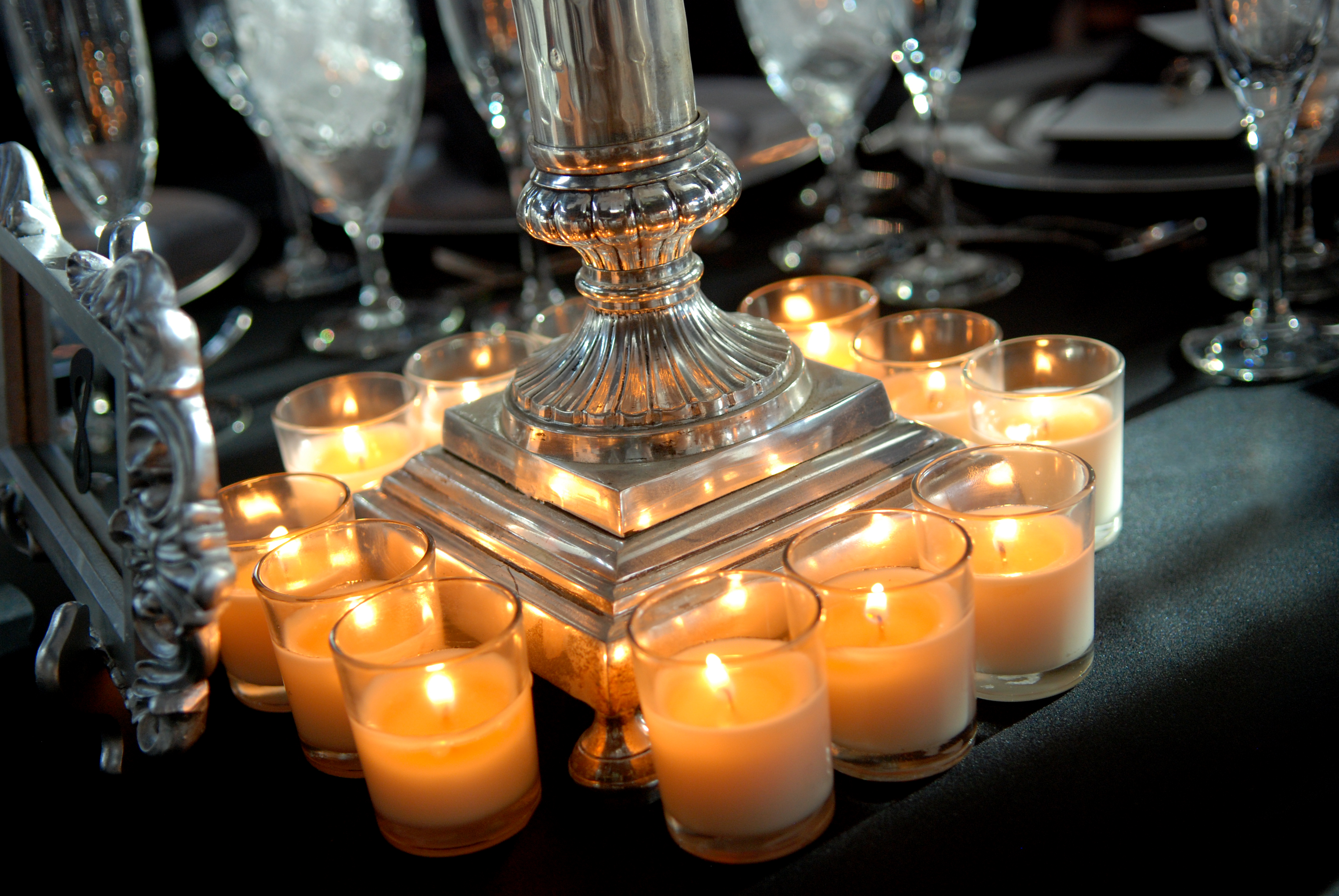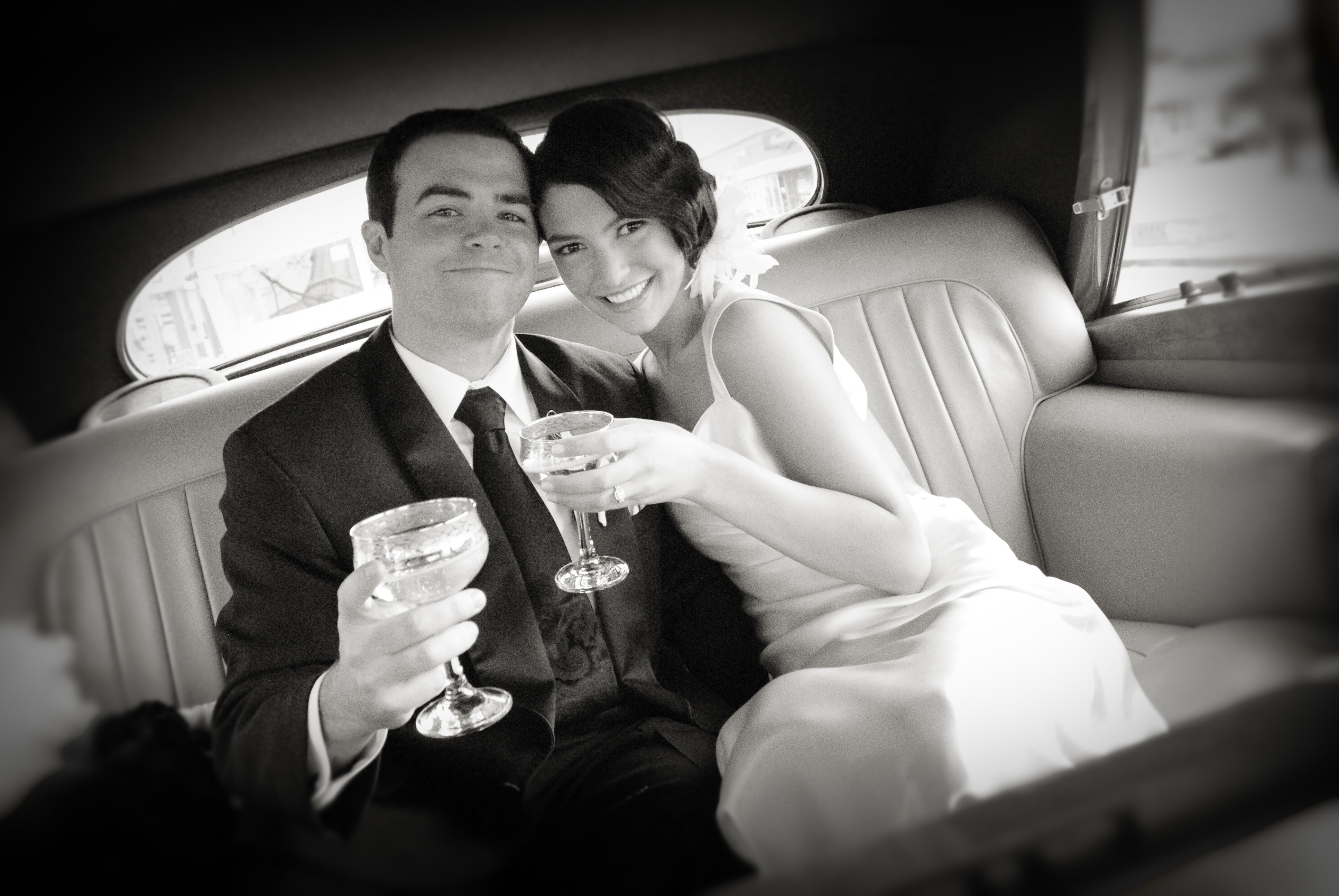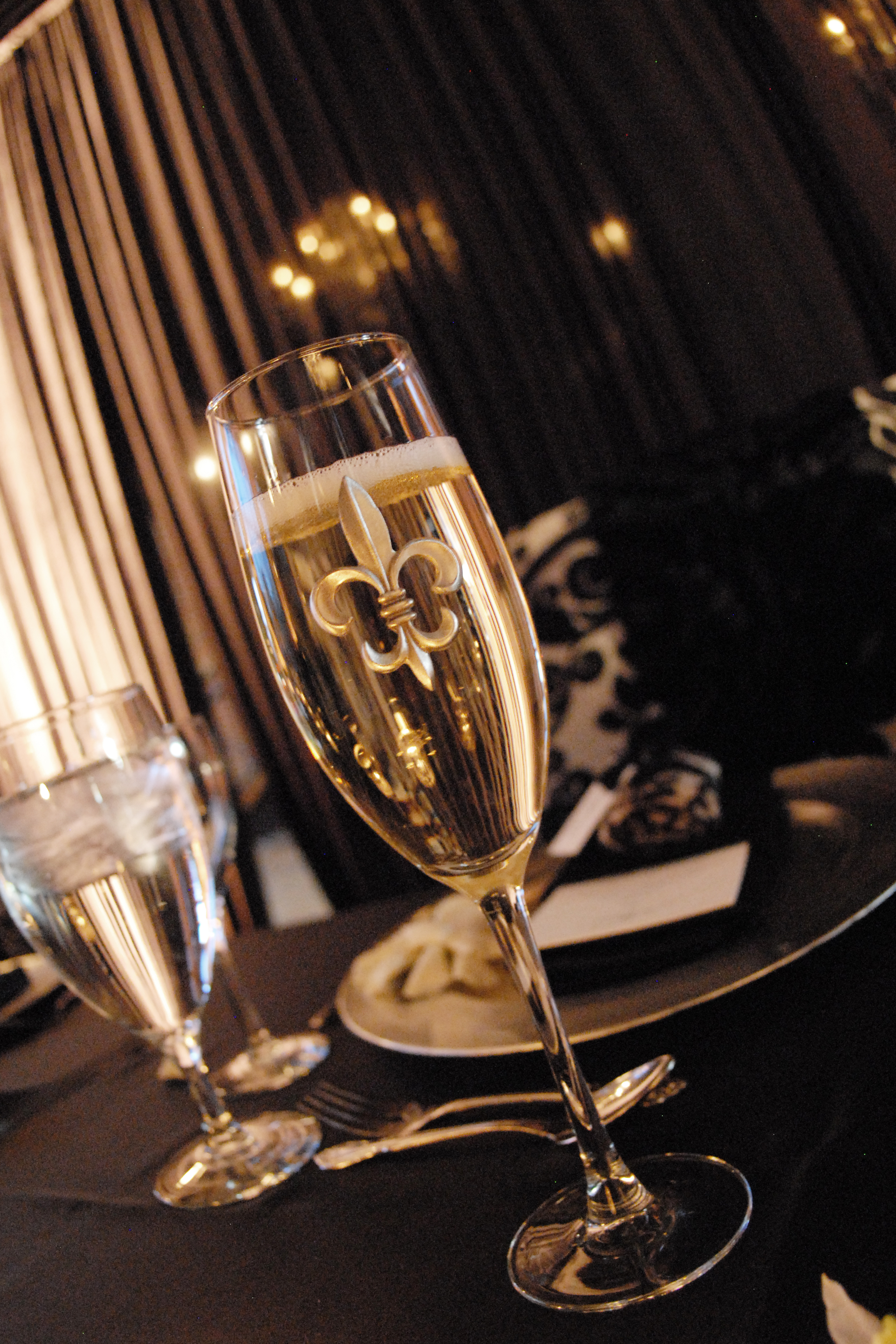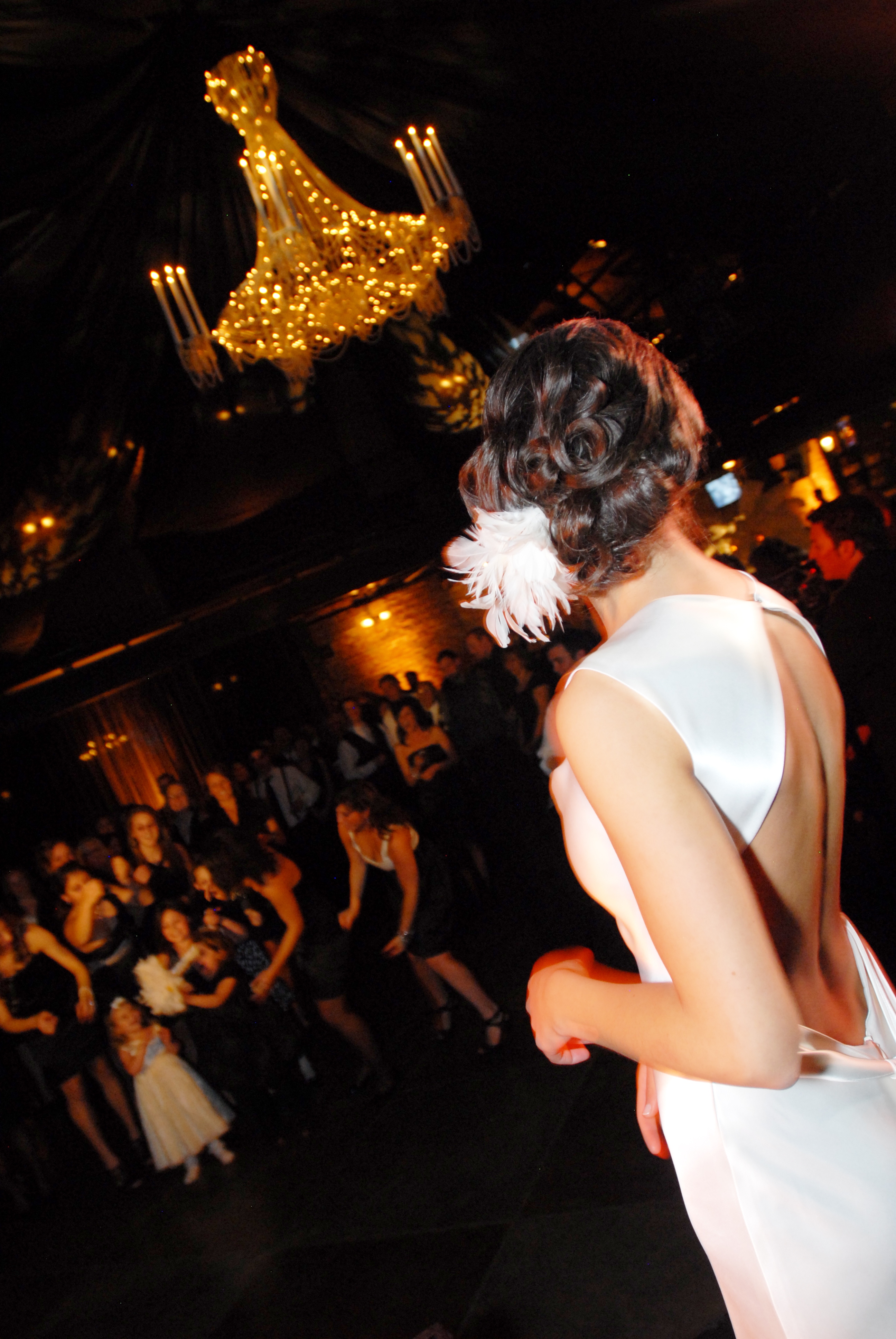 Nearly 180 guests dined and danced in a ballroom transformed into a black and white wedding extravaganza. A three-piece jazz band serenaded guests during cocktail hour upstairs, looking down upon the decorated venue. Old black and white Audrey Hepburn movies such as Roman Holiday and Love in the Afternoon played silently in the background on the televisions throughout the venue all evening. Two crystal chandeliers greeted guests in the entrance, a gorgeous, 8 foot tall chandelier lit the center of the dance floor and black drapery gracefully adorned the walls. Adding to the vintage ‘look’ was the large feathers and orchids that were beautifully placed in vintage candelabras on the guests’ tables and hundreds of lit candles in mercury glass containers flickered throughout the evening.