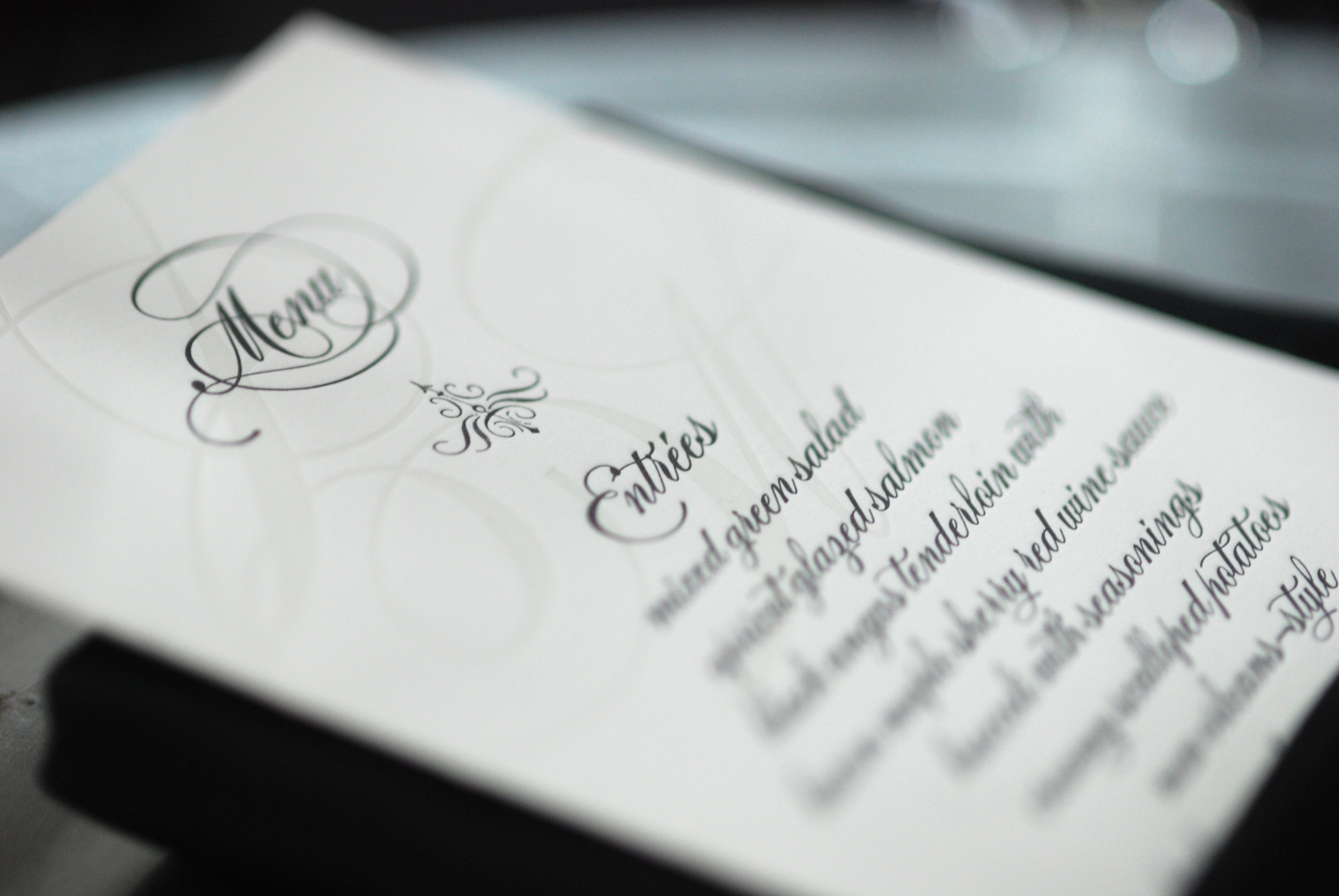 Custom letterpress menus, which you can find at Fleur de Lis, were set at each place setting. Mercury glass containers spaced along the bar held custom printed match boxes, and custom napkins with the couple’s monogram were neatly placed at each bar.