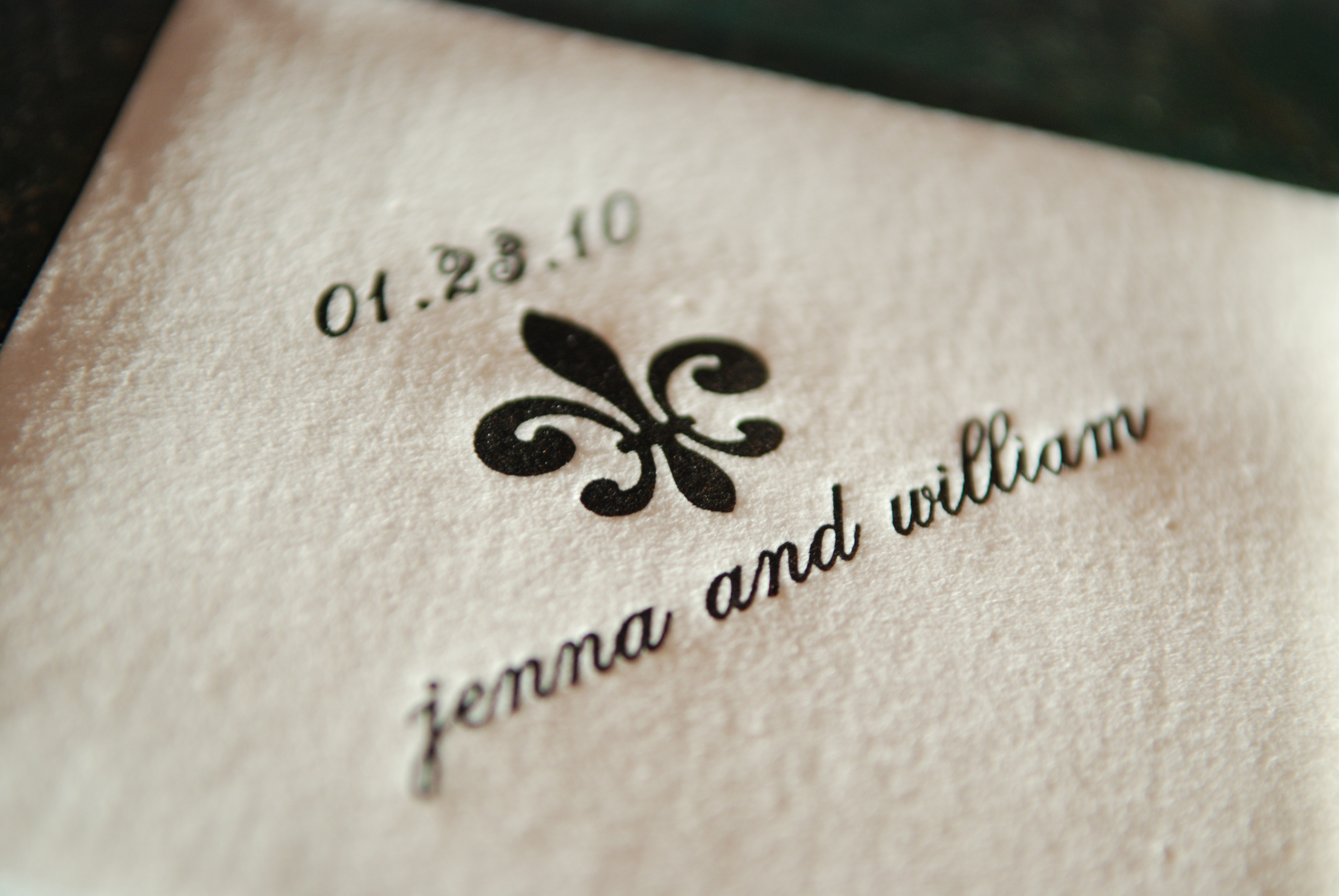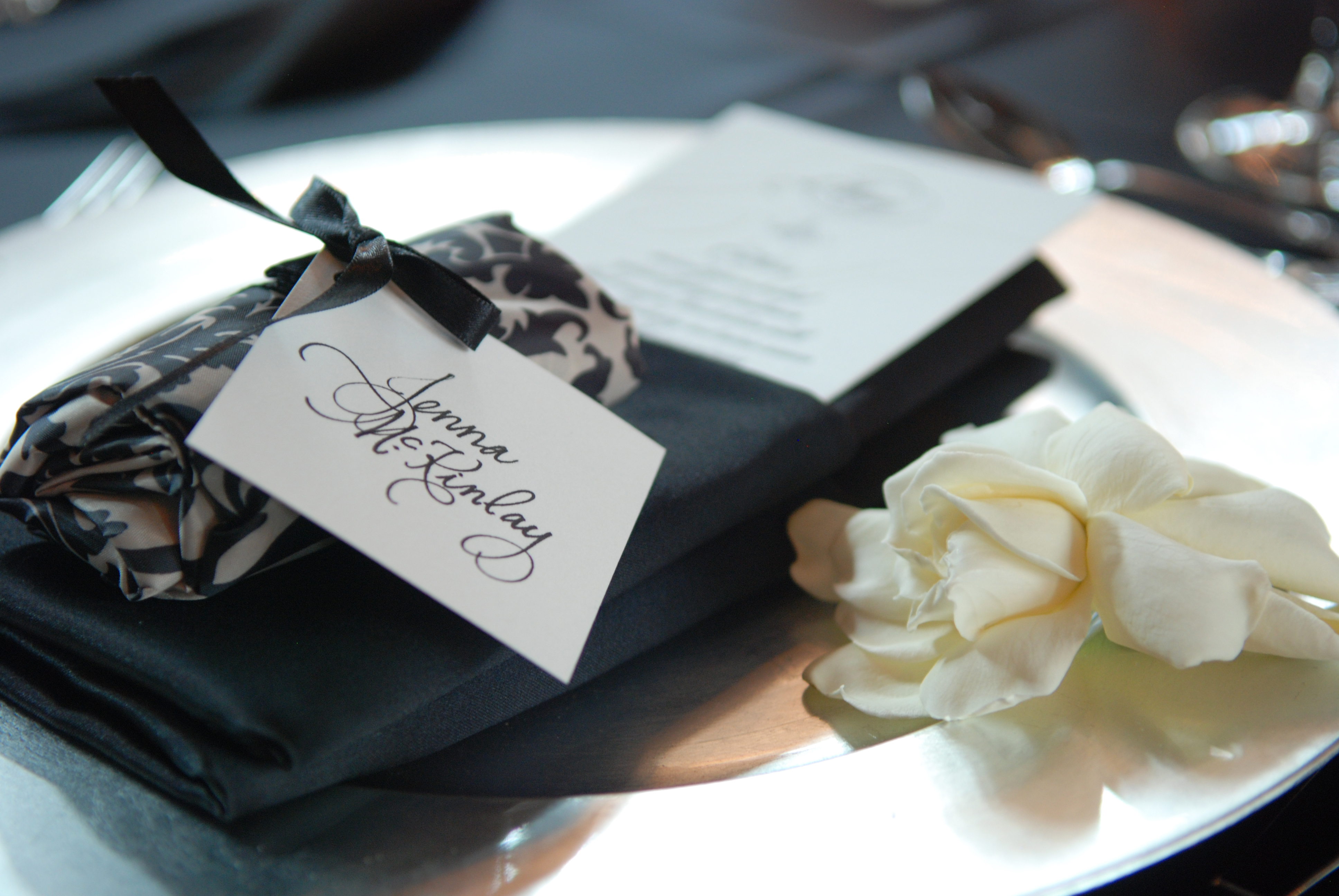 The details of the wedding were flawless. Vintage skeleton keys, bought from Etsy seller, Ashbury Lane, served as the escort card for each guest. Our mom, the mother-of-the-bride, covered a large cork board with a black velour fabric. Our aunt Sue stitched Jenna and William’s monogram in the center of the board, and hooks held each vintage key. Guests signed their name and a note to the bride and groom on paper in the bride’s grandparent’s vintage typewriter. Each female guest received a black and white damask print Envirosax bag, and each male guest received a custom hand-rolled cigar made by Clay Carlton, Palma Cigars, both of which both served as a place card and gift. And, the kids enjoyed their black and white colored Sixlets candies in custom round containers with Jenna and William’s monogram.