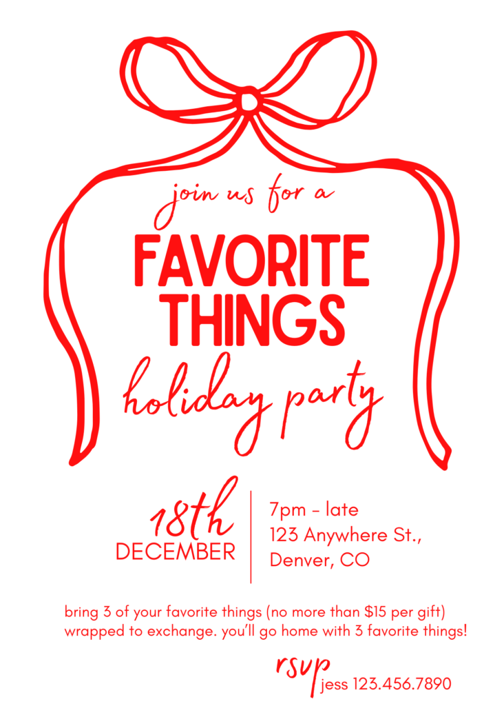 We created an adorable invite on Etsy to celebrate the favorite things party. You can make your own edits on Canva, or place the order and we will make the edits for you. Just leave all the details and your email in the notes section at checkout, and we will send you the invite file.
