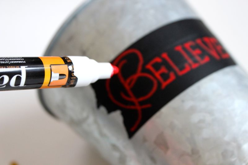 Step 2: Write your favorite quotes from the Christmas movies. We chose, ‘Merry Christmas you filthy animal,” from Home Alone, “Treat everyday like Christmas,” from Elf and “Believe,” from The Polar Express. Use the Painter’s Markers. You can use a pencil to draft it before it’s permanently on there with the markers.