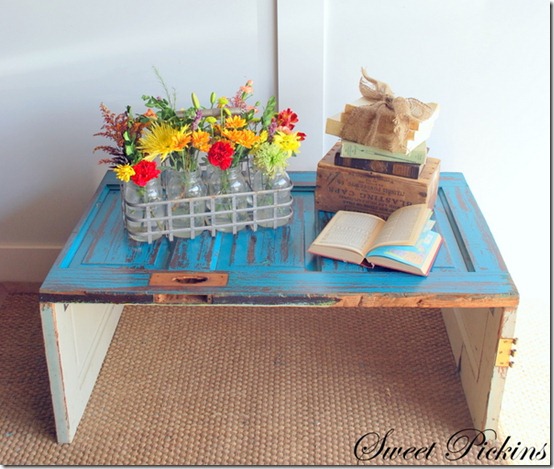 {Sausha at Show and Tell is so talented and created this vintage coffee table from an old door…I have to say I’m impressed. Visit her site to learn how she did it and browse her pieces for sale.}