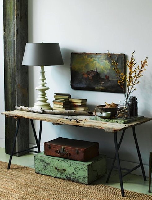 {I love the vintage vibe with the modern legs on this door-made-table from Content in a Cottage. You can find saw horses to use as table legs for under $20 at Ikea.}