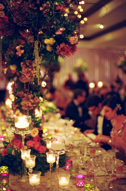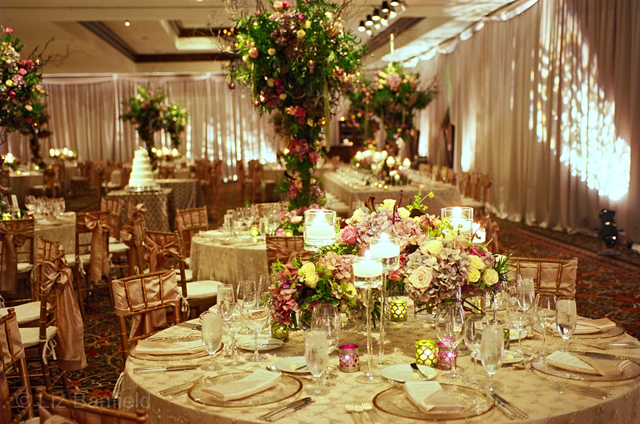 Crystals hung from the chandeliers for that perfect sparkle, the tall and short arrangements of hydrangeas, roses, calla lilies, larkspur, orchids, fern shoots, tea roses and hanging amaranthus in a palette of eggplant, purple, champagne and chartreuse were absolutely gorgeous, the candlelight was so romantic and the band – WOW. I became a groupie of the phenomenal L.A.based band, L.A. All Stars, in just one night. 🙂