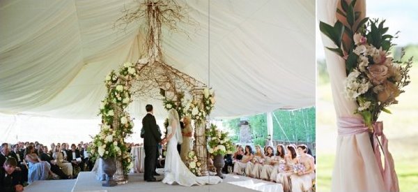 The white tent set-up for the ceremony at the base of the Bachelor Gulch mountain was absolutely breathtaking. Guests savored every moment under the draped tent as Julie walked down the long, carpeted aisle, escorted by her mom and dad to meet her groom under the hand-made huppah.