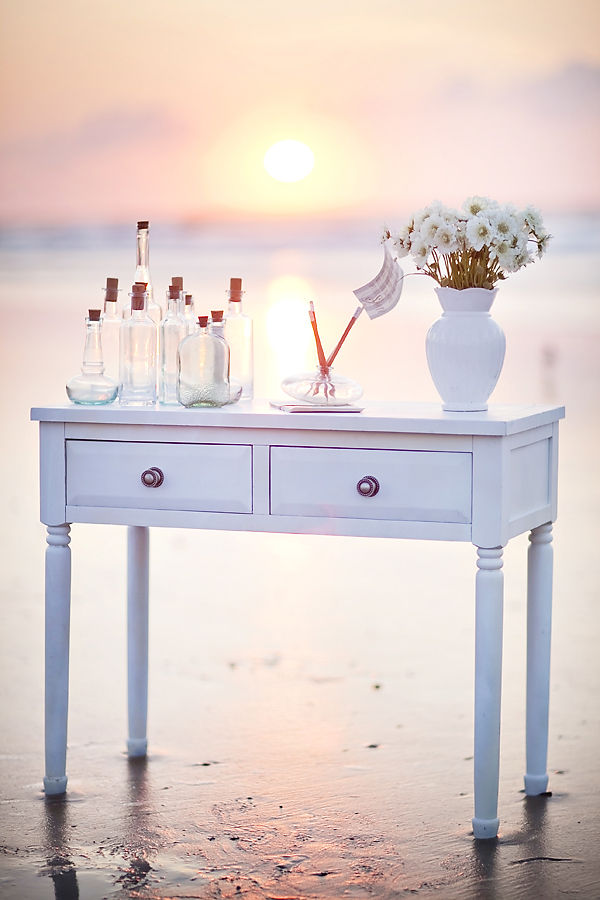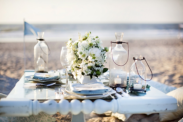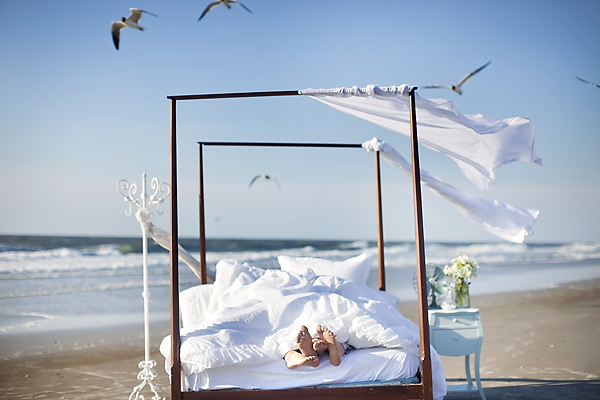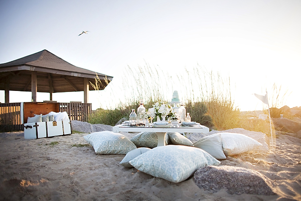 This wedding via Style My Pretty is so simple and stunning. I love all the details and the white and pale blue color palette. The bed on the beach – I want to jump in it now. The beautiful table setting, messages in a bottle and cozy pillows for seats…adorable. And, dancing under the stars in the soft sand, and kissing in a white boat in the water…so romantic.